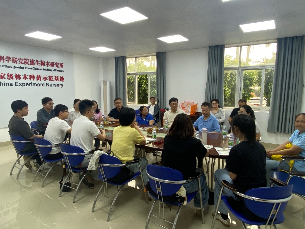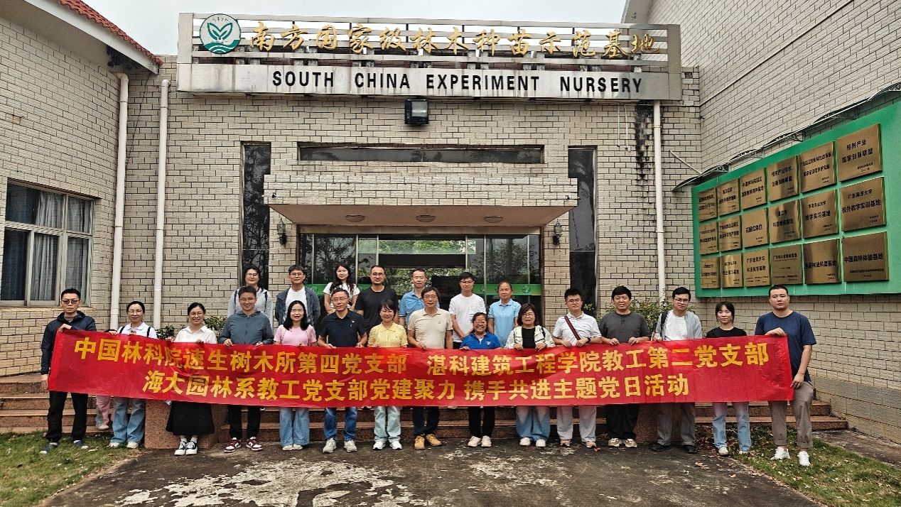 在深入交流的基础上,三方围绕支部共建、科研合作、人才培养、技术服务等核心议题达成共识,确立了“互学互鉴、优势互补、协同发力、共促绿美”的合作方向。学习交流结束后,全体党员在南方国家级林木种苗示范基地工作人员的带领下,开展实地观摩实践活动。作为我国林业一流的林木良种研究和繁育基地,该基地在林木良种选引育繁、科技成果转化、生态保护等方面成效显著,为绿美湛江建设提供了坚实的苗木保障和技术支撑。