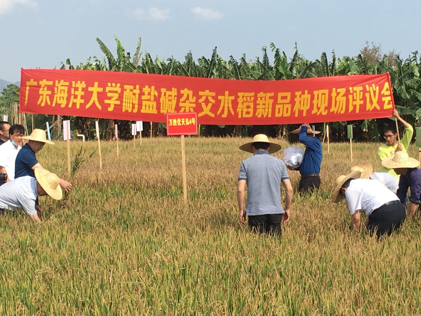 4月15日,国家杂交水稻工程技术中心组织国内水稻研究知名专家,在海南三亚崖城头塘村国家耐盐碱水稻技术创新中心基地对公司郭建夫、黄永相海水稻研究课题组与广东天弘种业有限公司合作育成的耐盐碱杂交水稻新品种进行了现场评议。伟德国际1949经理陈进军教授、生物技术系主任胡汉桥教授、作物学科带头人郑殿峰教授、周鸿凯教授等参加了评议会。