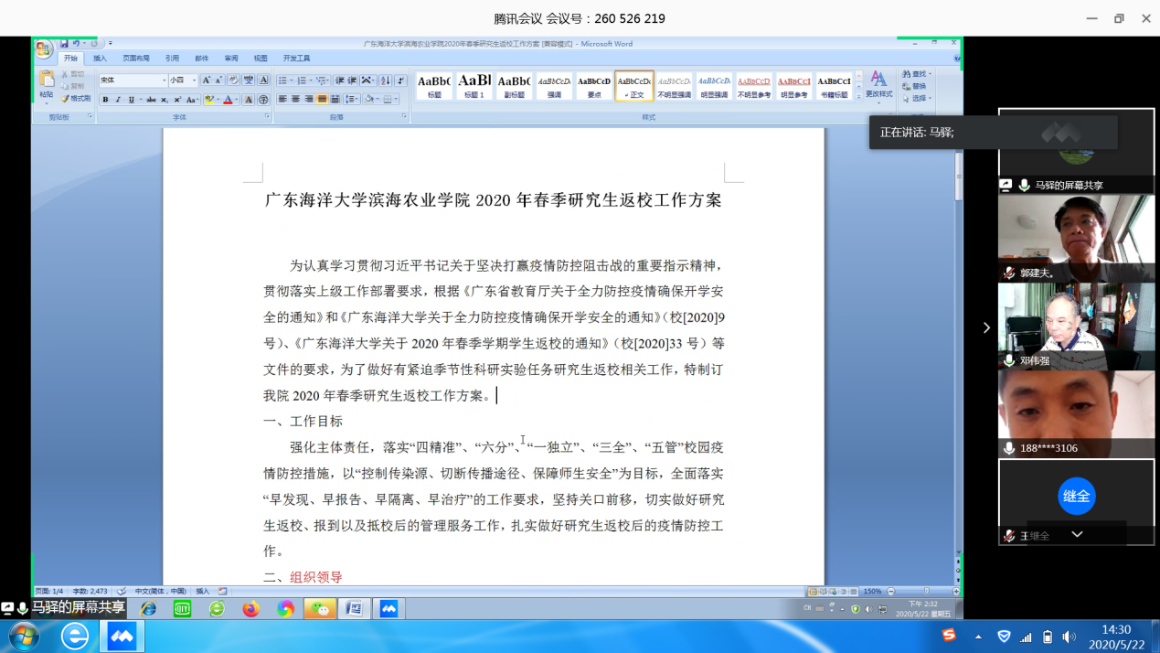 会上,分管研究生工作的马驿副经理解读了《伟德国际19492020年春季研究生返校工作方案》,成立公司2020年春季员工返校工作小组和学科研究生指导工作小组,并传达了公司研究生院对研究生返校要求。