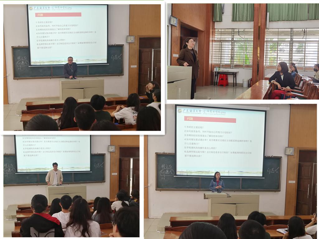 为了更有针对性地了解考研同学的需求和疑惑,在会议前两个支部进行了广泛意见征求并形成了分类提纲。在会议中,翟周从大的考研环境和公司近五年考研情况着手,重点分析了动物科学系和动物医学系同学的考研比例、考研院校和专业以及发展情况,鼓励有考研意向地同学坚定考研决心。在此基础上,翟周结合往年同学在考研中成功或失败等案例,围绕考研流程是什么、是否跨专业考研、如何有效复习考研、如何选择报考的院校等为同学作了详细而又客观地解答。他衷心地希望同学们在大学期间能够夯实基础、准确定位、正确报考、持之以恒,以扎实学业、优秀成绩实现自己的梦想。在本校攻读研究生的陆惠娴、杨讯业以自身的考研经历告诉师弟师妹要尽早进入考研状态并分享了考研流程和复习的心得。王广旭、刘斌和朱晓清主要从考研心态、院校的特点和考研资源获取途径等全方位多角度地为同学们答疑解惑。