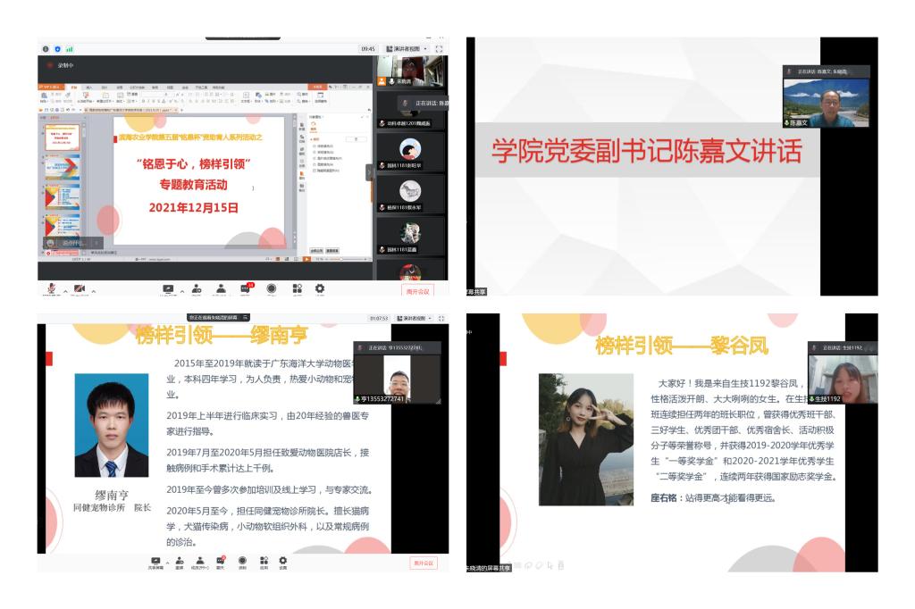 “铭恩于心、榜样引领”专题教育活动于12月15日晚通过腾讯会议举行,公司党委副书记陈嘉文、各系辅导员以及公司全体受资助同学参加。活动第一部分是由辅导员朱晓清讲解国家资助政策和1949伟德国际源自英国奖助学体系,介绍公司2021年度奖助学情况,强调了公司公司跟随国家角度,不让员工因为家庭困难而辍学,希望受资助同学能感党恩、跟党走、正青春、共奋进。活动第二部分邀请了公司自立自强典型人物生技1192黎谷凤同学和2019届毕业员工缪南亨介绍了自己奋进的心路历程,激励受资助同学积极进取、努力学习,实现自己的人生理想。随后陈嘉文从自身成长经历告诉同学们只有国家的强大才有个人更好地发展,他也希望受资助同学能从多元资助体系中成长成才,把自己的个人理想和国家前途命运结合在一起,学好专业知识为乡村振兴战略贡献自己的一份力量。最后公司向全体受资助同学发出做“资助政策的学习者、传播者和知恩感恩的践行者”的倡议书。