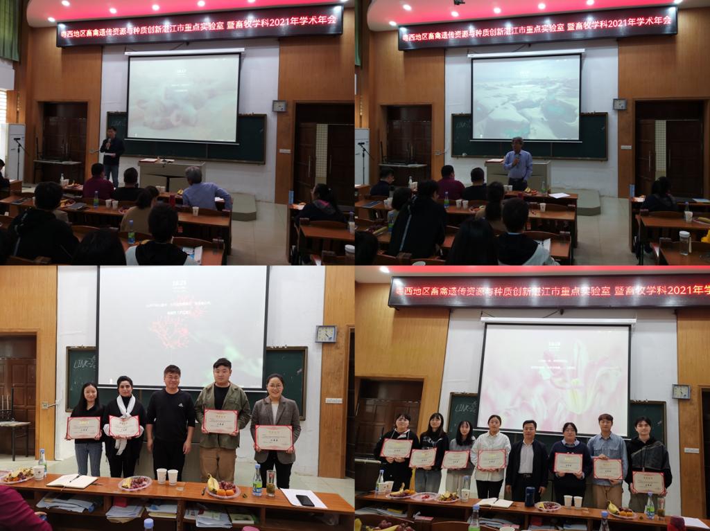 会议主题为“新种质、新方法、新技术、新模式”,20位硕士研究生分别围绕畜禽分子遗传与动物育种、高效繁殖技术、动物营养调控研究与新饲料资源开发、畜禽健康养殖与疾病防控等领域的研究进展进行了学术报告。经过评委现场打分,最终评选出一等奖2名,二等奖4名,优秀奖14名。学术报告会后,马驿副经理指出,畜牧学科在2021年取得的成绩离不开每位导师和研究生的辛苦付出,对获奖同学表示祝贺,希望畜牧学科在新的一年取得更大的成绩。同时,学术年会期间,畜牧学科带头人赵志辉教授还就团队队伍建设、博士点申报、青年教师成长等问题与学科教师进行了深入交流和充分研讨。此次学术年会的成功举办,对促进畜牧学科师生学术交流,活跃学术氛围,提升学科和湛江市重点实验室建设水平等具有积极作用。