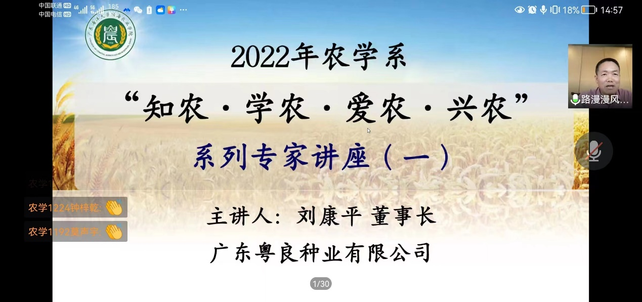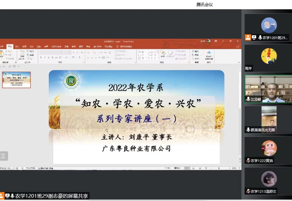 2022年9月14日下午,应公司农学系邀请,广东粤良种业有限公司刘康平董事长通过网络会议的形式,开展关于“知农·学农·爱农·兴农”系列讲座。讲座由系主任沈雪峰副教授主持,辅导员、班主任和2019、2020、2021和2022级农学专业两百多名员工聆听讲座。