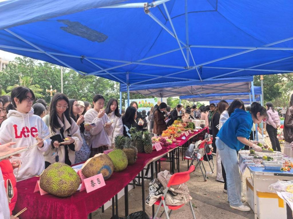 本届文化节匠心独运,设置了“有看、可玩、能尝”的多元化体验区,让师生们沉浸式感受园艺的无限魅力。在科普展区,波罗蜜、番茄、火龙果等一批公司自主选育的新品种及科研成果集中亮相,配合详实的讲解,充分展现了公司在热带园艺领域的深厚积淀与创新实力。智慧园艺、立体水培等前沿技术的展示,则描绘出现代农业的未来图景。水果品鉴区与蔬菜沙拉制作区人头攒动,新鲜的波罗蜜、番茄、火龙果等优品让师生们赞不绝口,实现了从“田间”到“舌尖”的美妙连接。“元气水果套圈派对”、“籽语寻踪”、“植物密码传递”等互动游戏,将园艺知识巧妙融入其中,欢声笑语不断,成为活动现场最具人气的焦点。落叶风铃、种子炸弹、干花书签、小花束制作等DIY活动,让同学们在动手创造中感受自然之美,一件件独具匠心的作品,承载着对美好生活的热爱与向往。精心布置的园艺主题秋千、繁花拱门、梦幻花伞以及意境深远的富贵竹盆景等展示区,构成了一系列绝美的打卡点,师生们纷纷驻足拍照,留下绚丽的记忆。